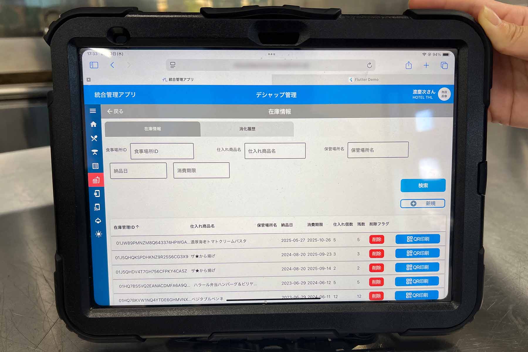 THLのレストラン(T-Cafe)では、食材を管理するシステムを開発し運用中です。キッチンスタッフが調理のオペレーションに入る前に、食材に貼られたQRコードを読み取ることで、自動的に在庫が減算される仕組みです。