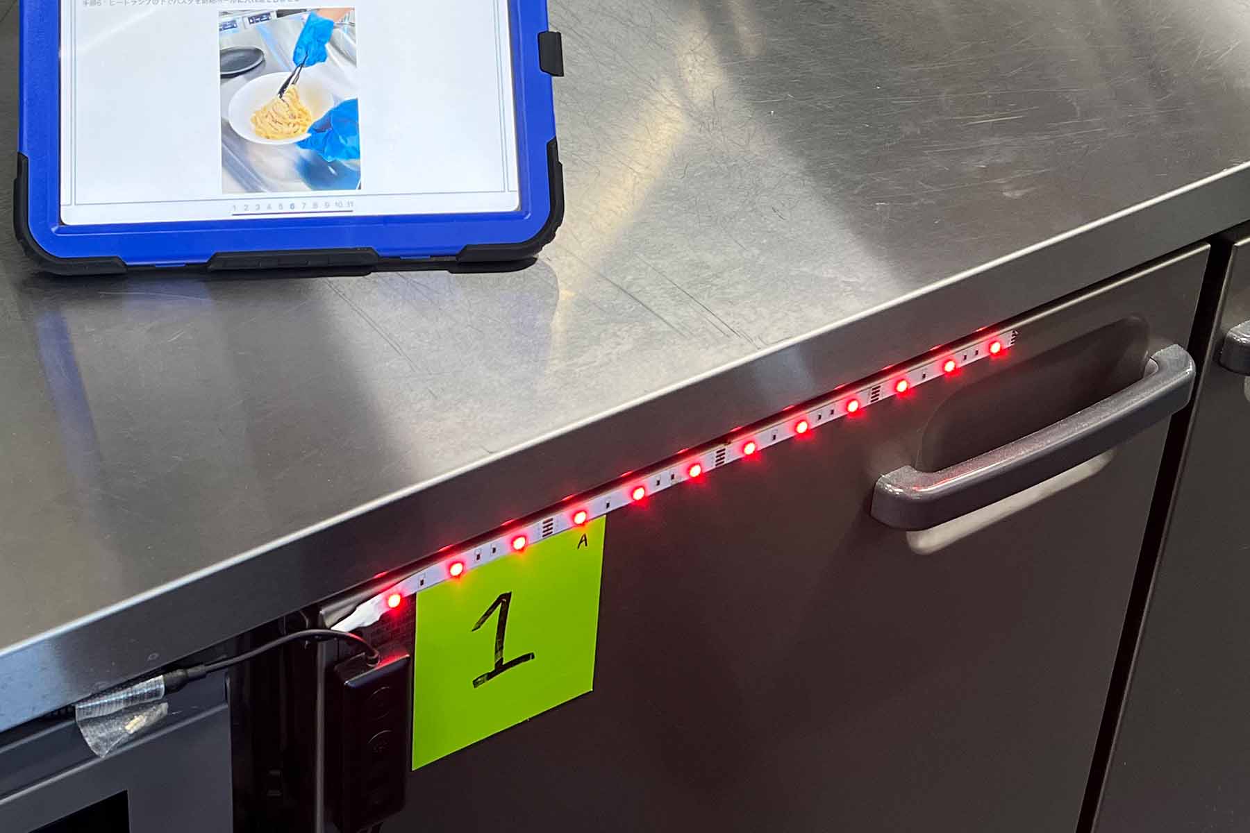 また、調理開始のタイミングで、必要な食材が入っている冷蔵庫が光って場所を知らせる仕組みも開発しています。 人がすべての情報を覚えておく必要がなくなり、レストラン業務に対応できる人の幅を広げることが狙いです。