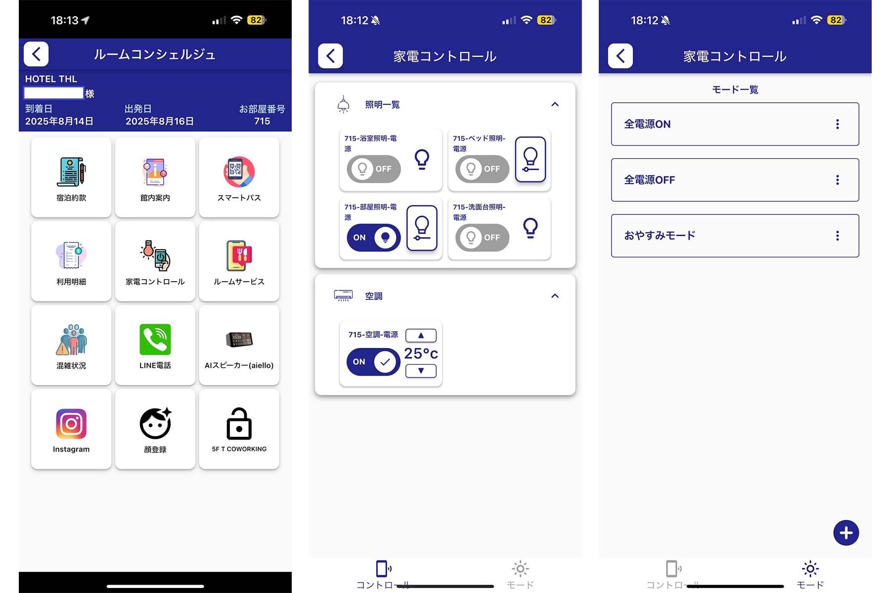 また、客室内の空調・照明機器、カーテン(1部の客室)はホテルシステムと連携しており、アプリ内の家電コントロール機能を通じてスマホから操作できます。